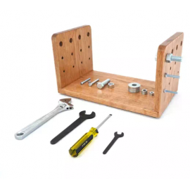 This test measures proficiency in using ordinary mechanic's tools.The test consists of tools and two uprights with bolts. The object is to disassemble all the bolts from one upright and reassemble them on corresponding rows of the other upright with the heads of the bolts inside. This type of skill is important in many different factory jobs, in in..